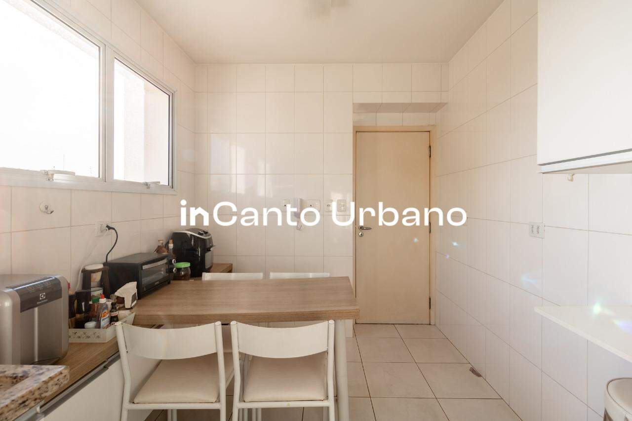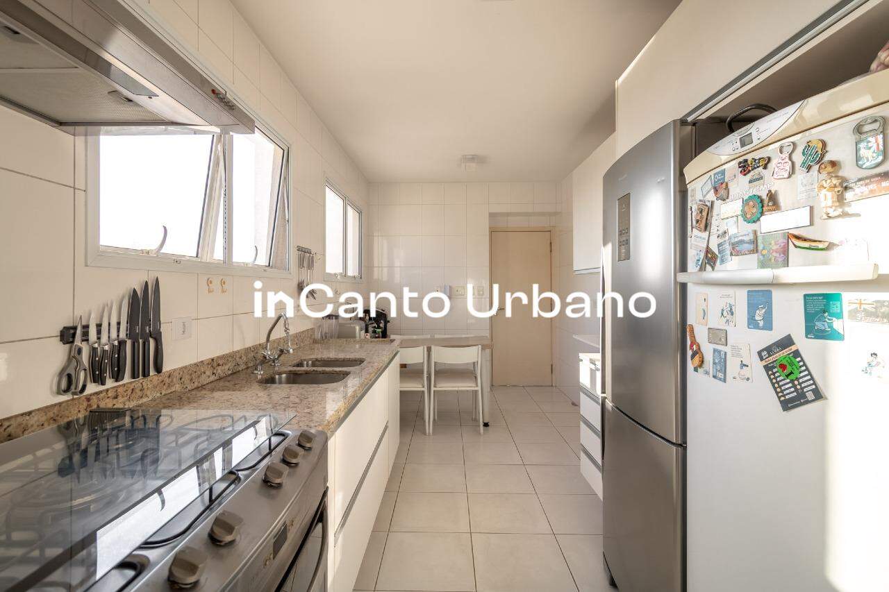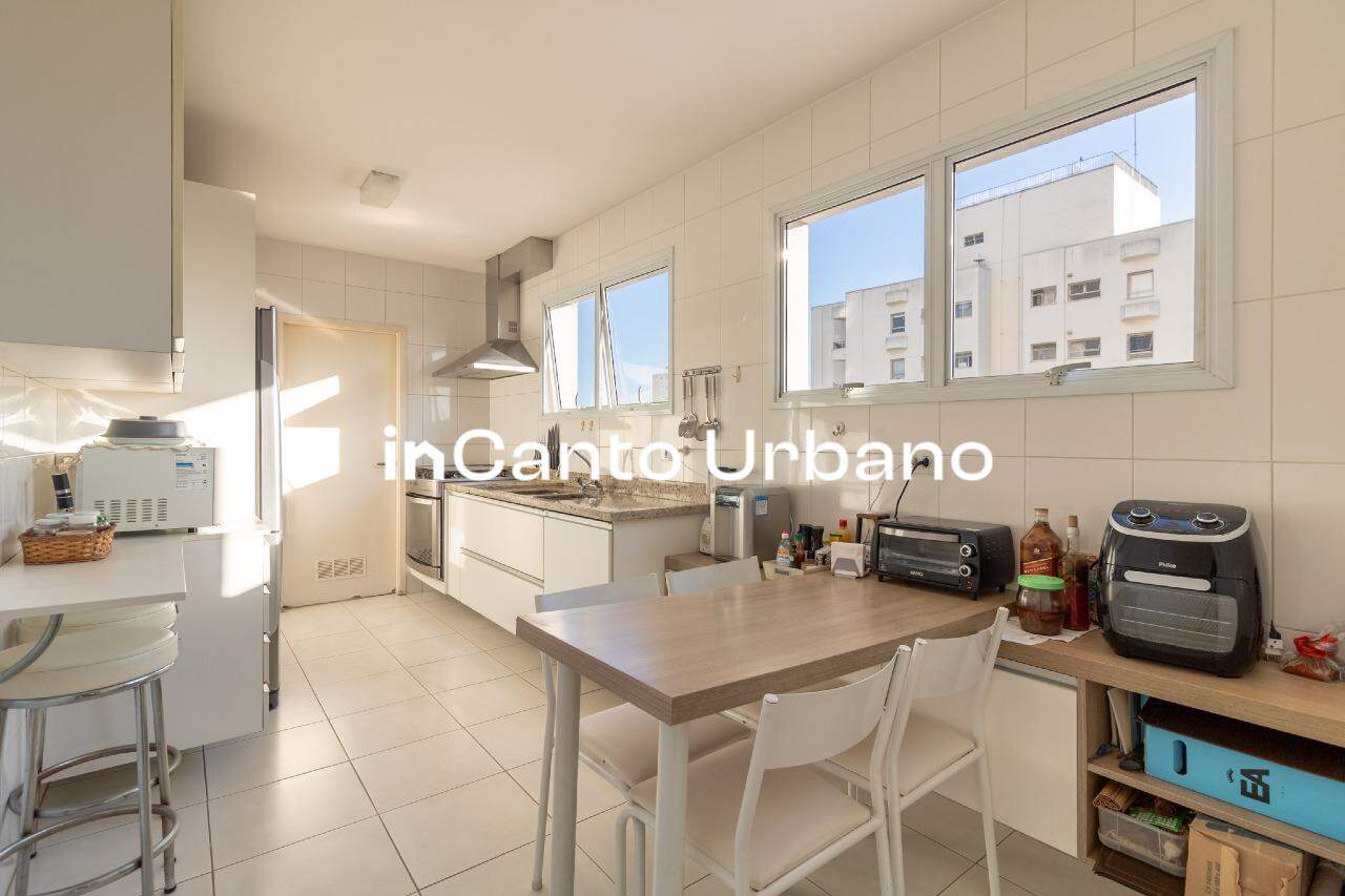 A cozinha, moderna e espaçosa, é um verdadeiro prazer: os janelões deixam o ar circular e revelam uma vista inspiradora da Pauliceia Desvairada — difícil decidir se é melhor cozinhar ou admirar a paisagem.