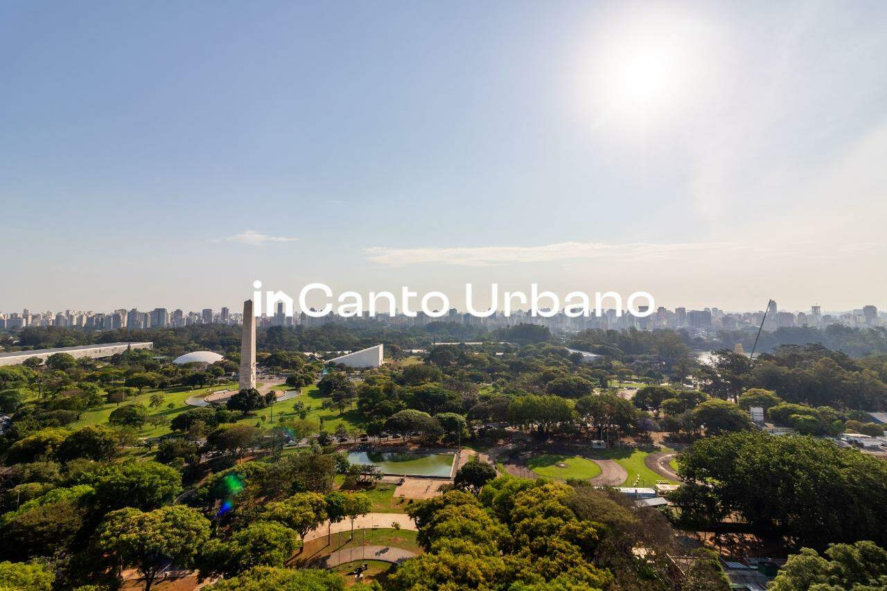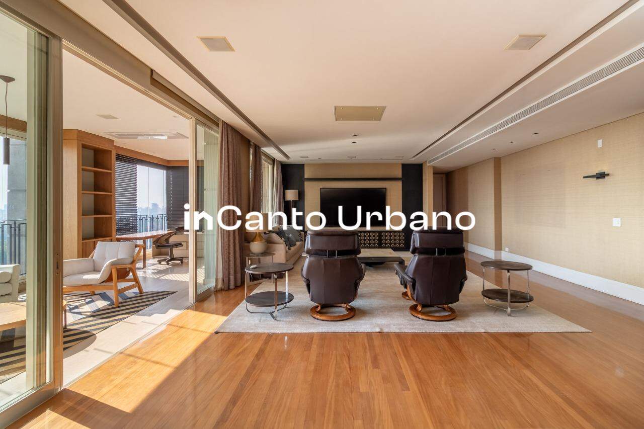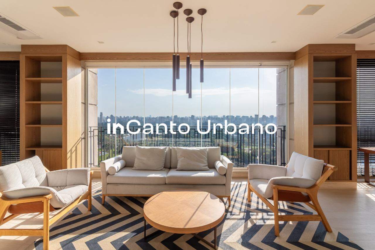 Com uma vista permanente para o Parque Ibirapuera, o living impressiona desde o primeiro olhar. São amplos ambientes integrados — quatro no total — que permitem múltiplas possibilidades de convivência, todos banhados por luz natural e com um cenário que muda conforme o dia avança.