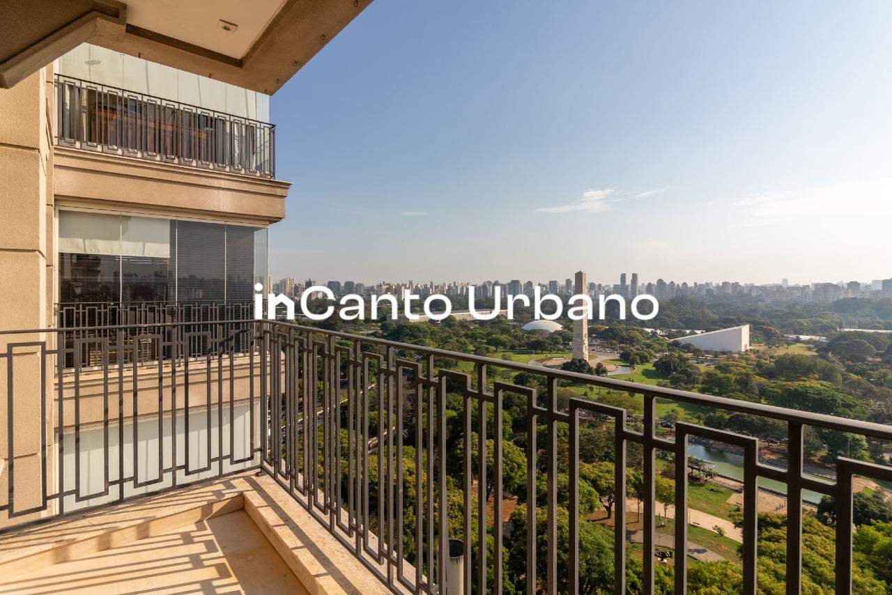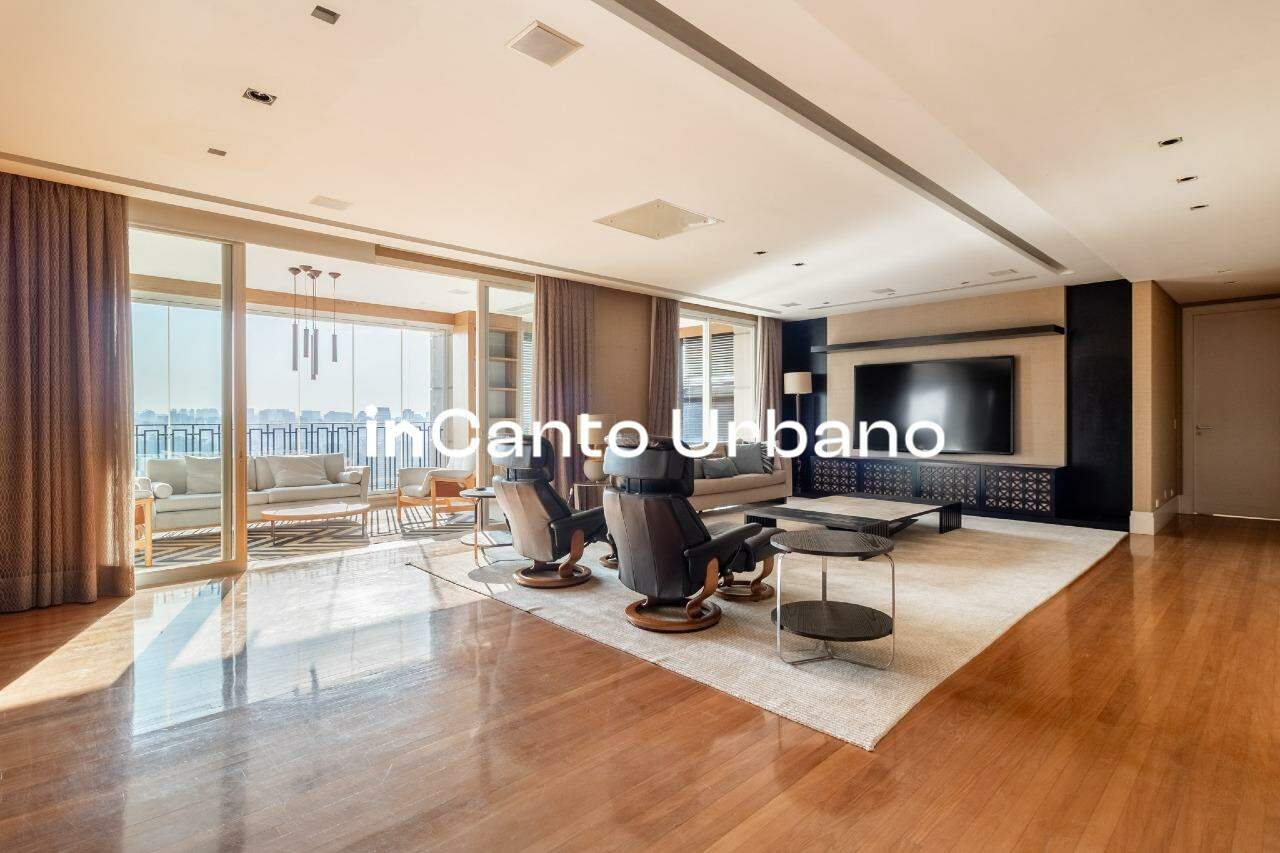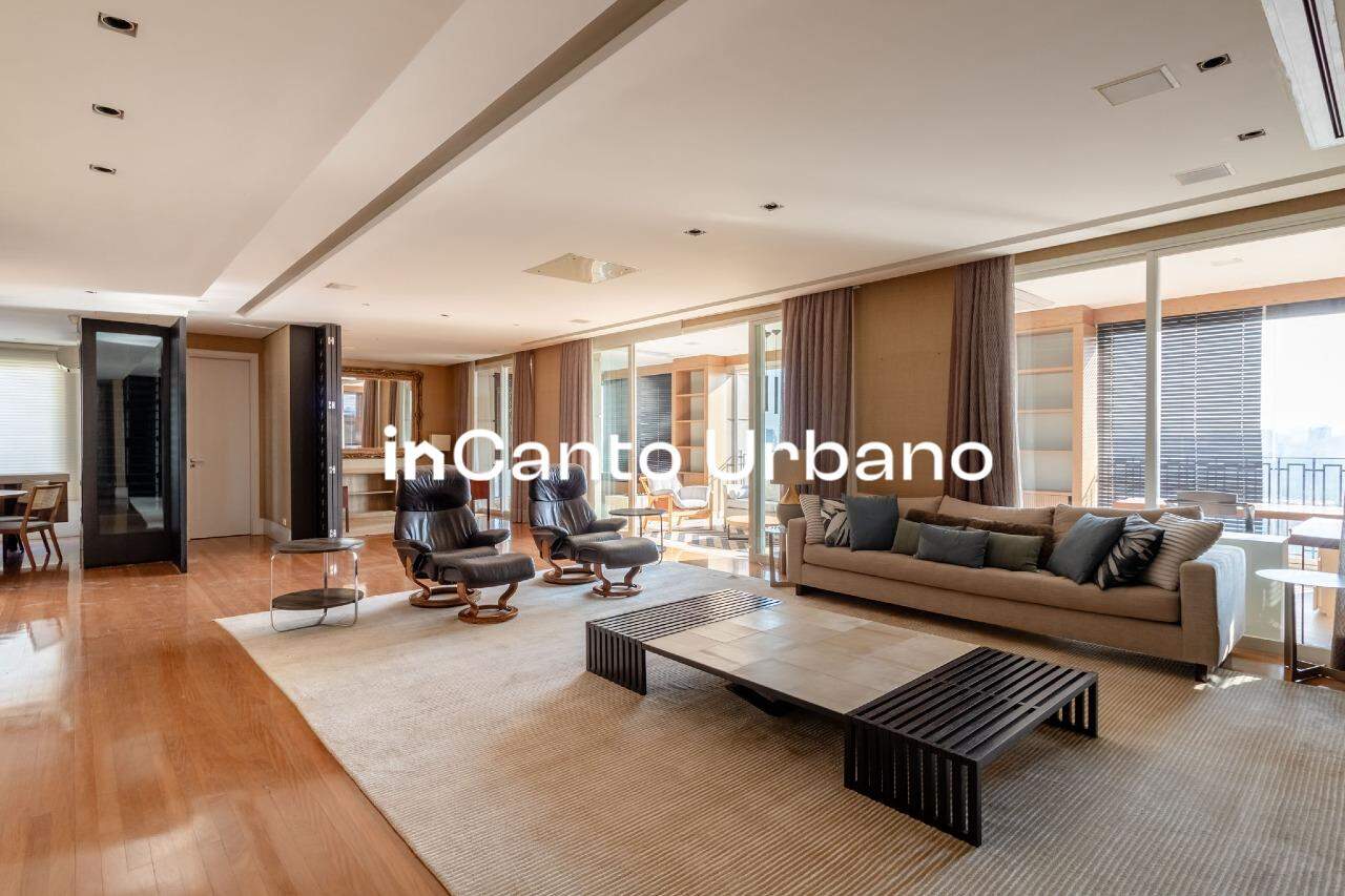 Com uma vista permanente para o Parque Ibirapuera, o living impressiona desde o primeiro olhar. São amplos ambientes integrados — quatro no total — que permitem múltiplas possibilidades de convivência, todos banhados por luz natural e com um cenário que muda conforme o dia avança.