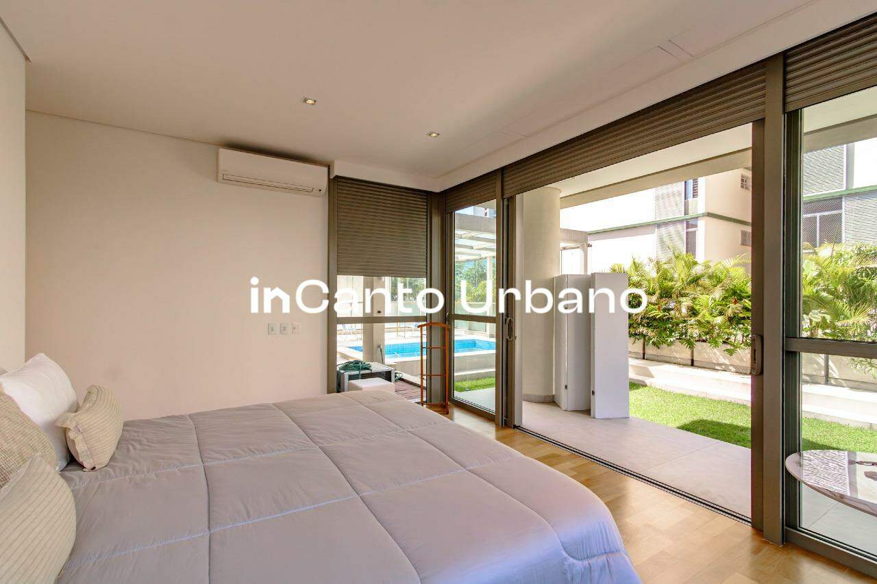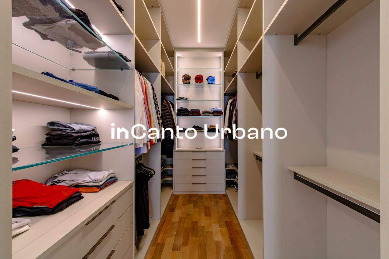 A área íntima conta com quatro suítes, sendo uma adaptada como escritório. A suíte master é um destaque à parte, com amplo closet e banheiro equipado com piso aquecido, cubas duplas e duchas duplas. Todas as suítes possuem armários planejados, portas de correr, persianas elétricas e acesso direto ao jardim, garantindo ventilação e iluminação excepcionais.